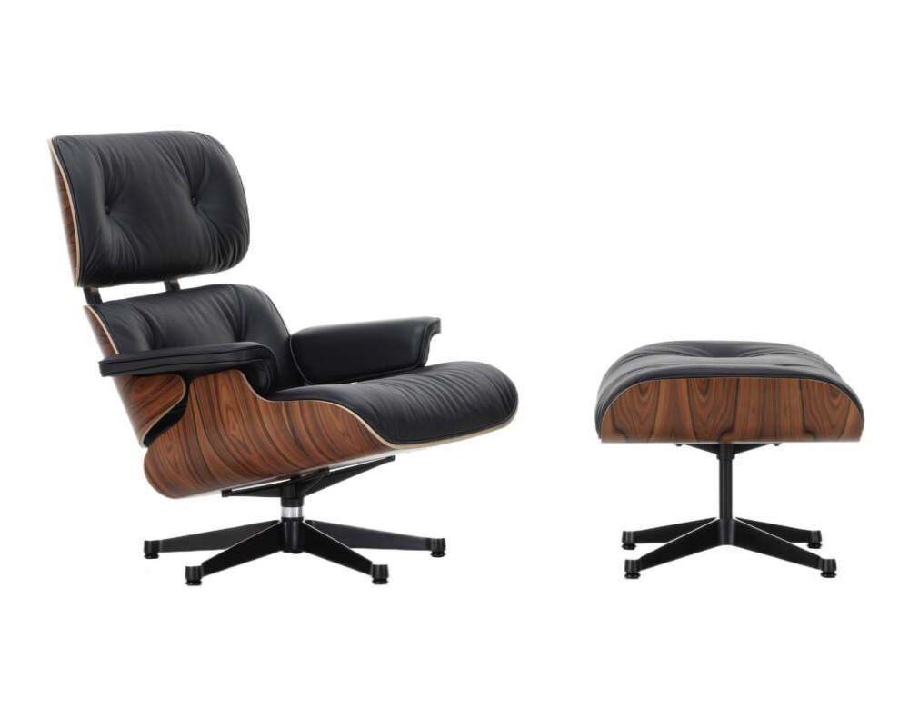 Kreslo Lounge Chair patrí už viac ako 60 rokov k nezameniteľným dizajnovým ikonám svetového formátu. Na prvý pohľad zaujme masívnou konštrukciou z palisandrovej dyhy, ktorá je ošetrená lakom na vodnej báze. Tá zabezpečuje ojedinelý bytelný základ celého systému, ktorý v kombinácii s koženými sedadlami a hliníkovou otočnou podnožou vytvára dokonalú kontrastnú súhru. Elegantné polstrované kožené sedáky zaisťujú okrem osobitého a nadčasového vizuálu tiež maximálny komfort. Kožený poťah je možné v prípade potreby odstrániť, aby sa dal ľahko vyčistiť a vymeniť. Konštrukcia kresla, jeho línie i každý záhyb sú premyslené naozaj do najmenšieho detailu.