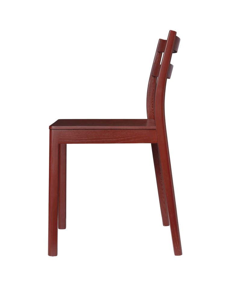 Stolička je vyrobená z masívneho jaseňového dreva a dyhy, čo jej zabezpečuje pevnosť, odolnosť a prirodzený vzhľad materiálu. Charakteristickým prvkom je operadlo s dvojitou lištou a zakrivené zadné nohy, ktoré podčiarkujú celkový tvar a dodávajú konštrukcii vizuálnu ľahkosť.
