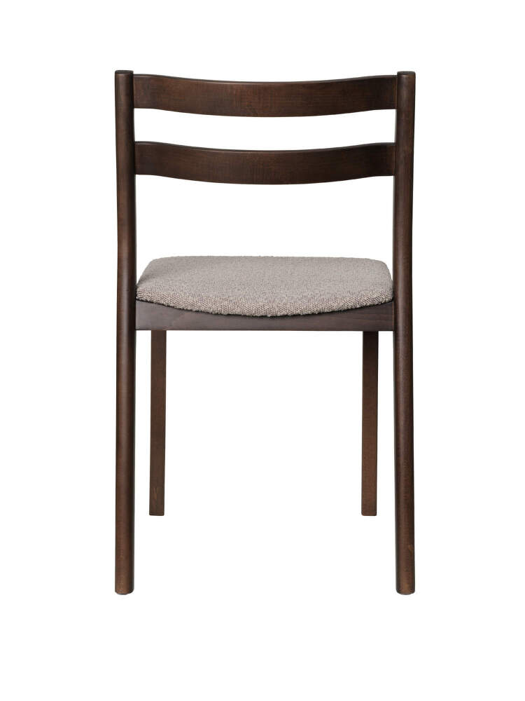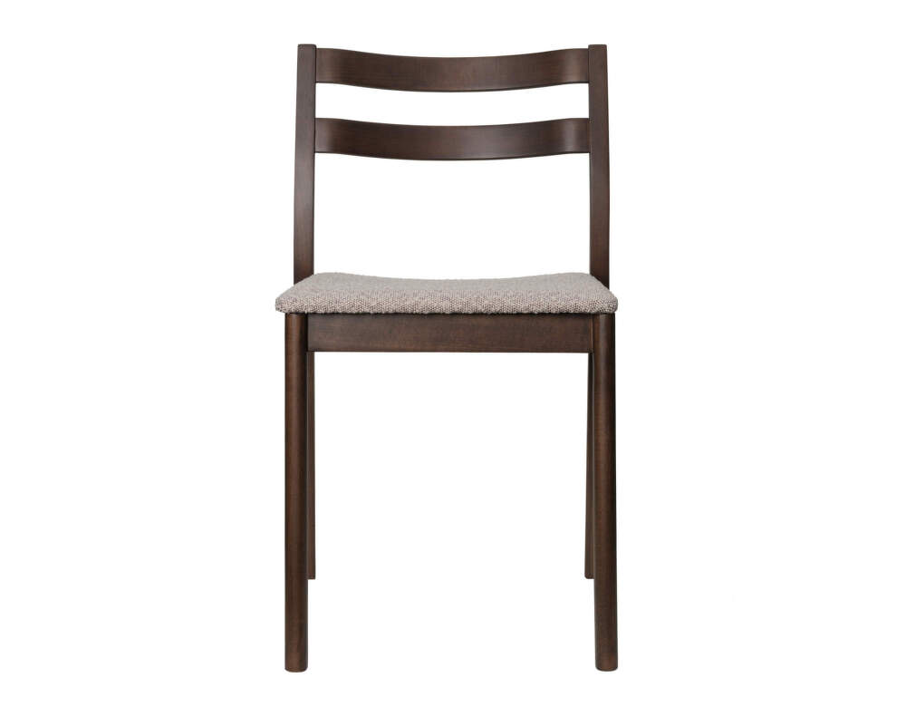 Stolička je vyrobená z masívneho bukového dreva a dyhy, čo jej zabezpečuje pevnosť, odolnosť a prirodzený vzhľad materiálu. Charakteristickým prvkom je operadlo s dvojitou lištou a zakrivené zadné nohy, ktoré podčiarkujú celkový tvar a dodávajú konštrukcii vizuálnu ľahkosť. Polstrovaný sedák dodáva stoličke ešte väčšie pohodlie.