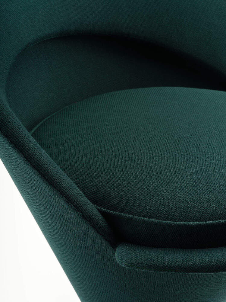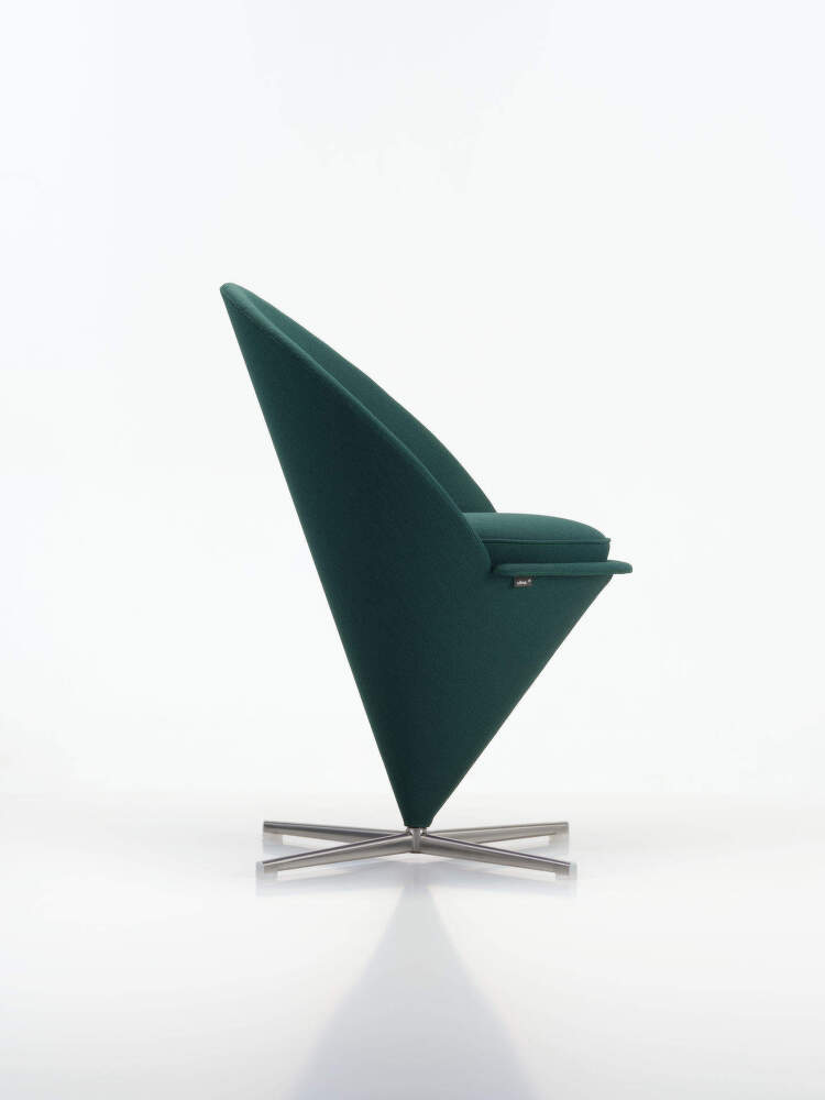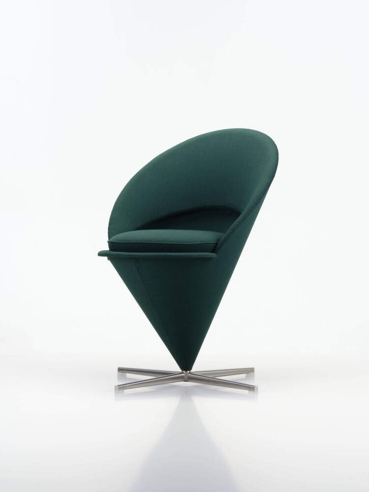 Kreslo Cone Chair patrí k najikonickejším návrhom Vernera Pantona a dodnes si zachováva výraznú, sebavedomú siluetu. Kužeľový tvar tvorí pevný architektonický základ, z ktorého vyrastá komfortná čalúnená škrupina s operadlom a podrúčkami. Dizajn pôsobí kompaktne, no zároveň ponúka pohodlné sedenie.