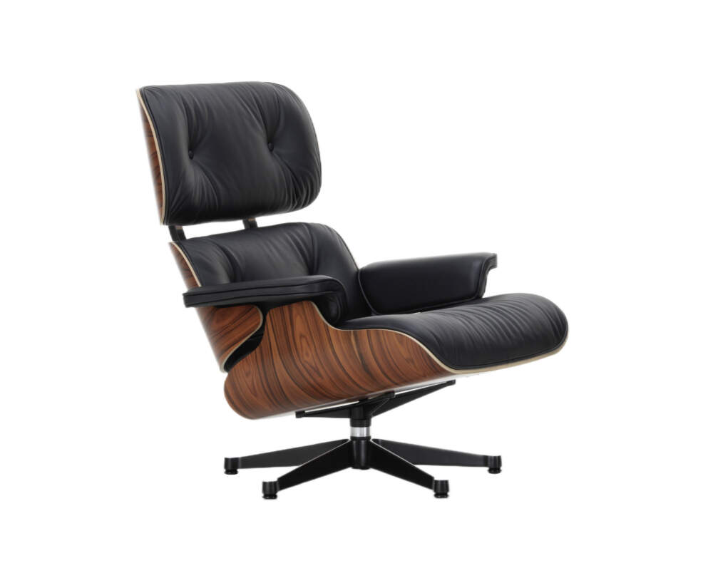 Kreslo Lounge Chair patrí už viac ako 60 rokov k nezameniteľným dizajnovým ikonám svetového formátu. Na prvý pohľad zaujme masívnou konštrukciou z palisandrovej dyhy, ktorá je ošetrená lakom na vodnej báze. Tá zabezpečuje ojedinelý bytelný základ celého systému, ktorý v kombinácii s koženými sedadlami a hliníkovou otočnou podnožou vytvára dokonalú kontrastnú súhru. Elegantné polstrované kožené sedáky zaisťujú okrem osobitého a nadčasového vizuálu tiež maximálny komfort. Kožený poťah je možné v prípade potreby odstrániť, aby sa dal ľahko vyčistiť a vymeniť. Konštrukcia kresla, jeho línie i každý záhyb sú premyslené naozaj do najmenšieho detailu.
