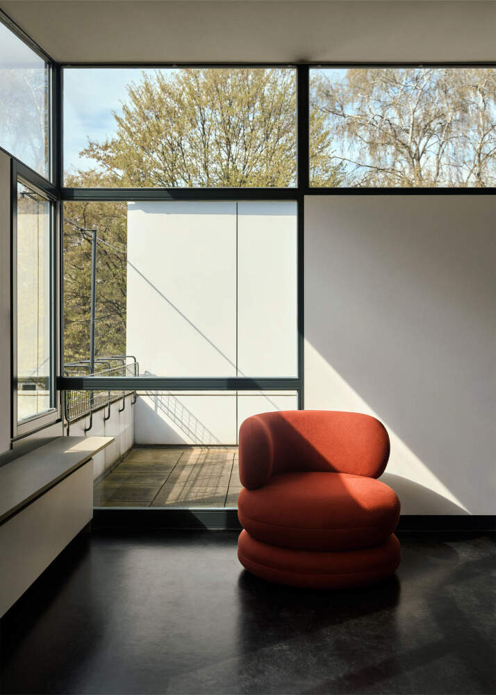 Dominantným prvkom je široké operadlo v tvare písmena U, ktoré plynulo prechádza do podrúčok a umožňuje pohodlné sedenie v rôznych polohách. Trojdielna vrstvená konštrukcia a kruhový tvar dodávajú kreslu osobitý, jemne sochársky výraz, bez toho, aby pôsobilo ťažkopádne.