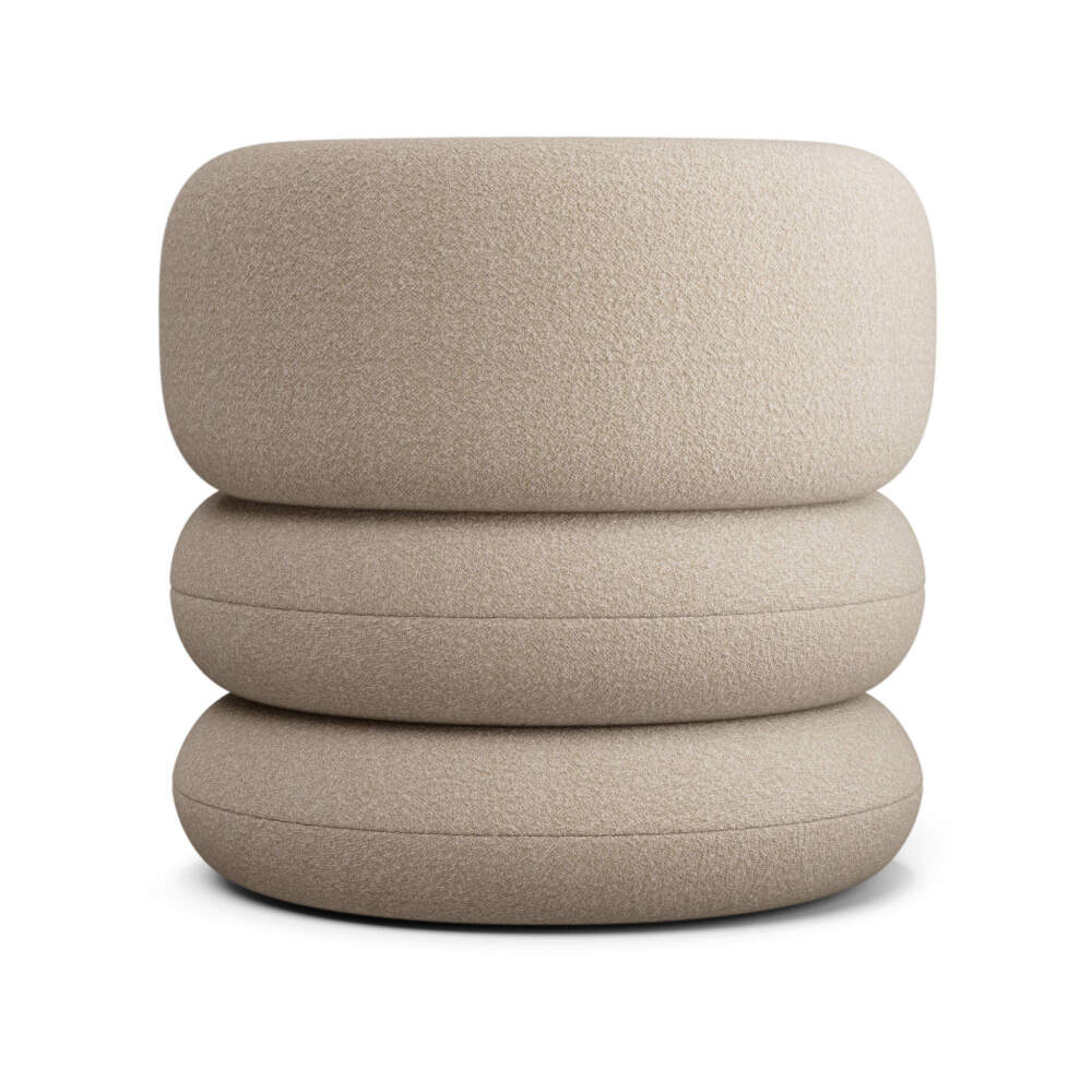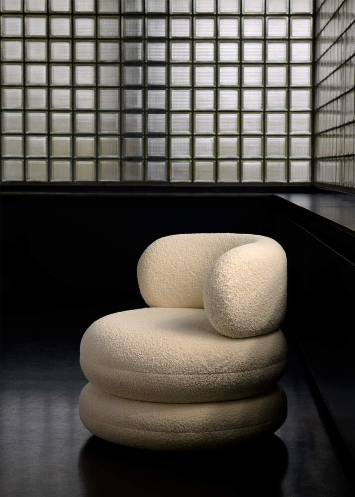Dominantným prvkom je široké operadlo v tvare písmena U, ktoré plynulo prechádza do podrúčok a umožňuje pohodlné sedenie v rôznych polohách. Trojdielna vrstvená konštrukcia a kruhový tvar dodávajú kreslu osobitý, jemne sochársky výraz, bez toho, aby pôsobilo ťažkopádne.