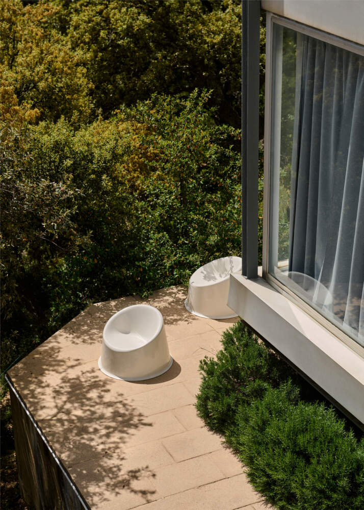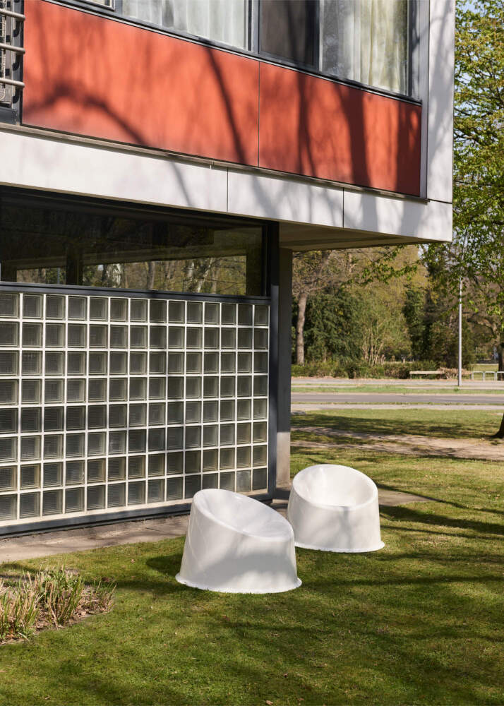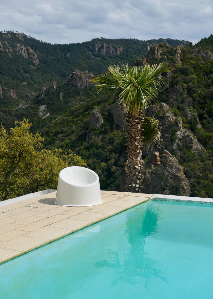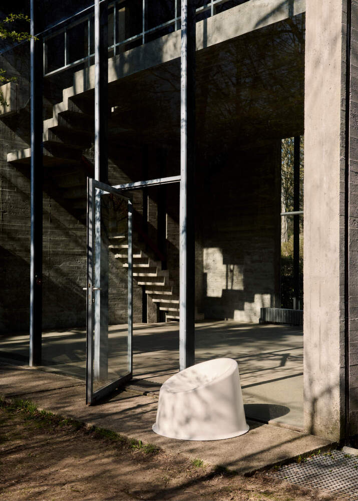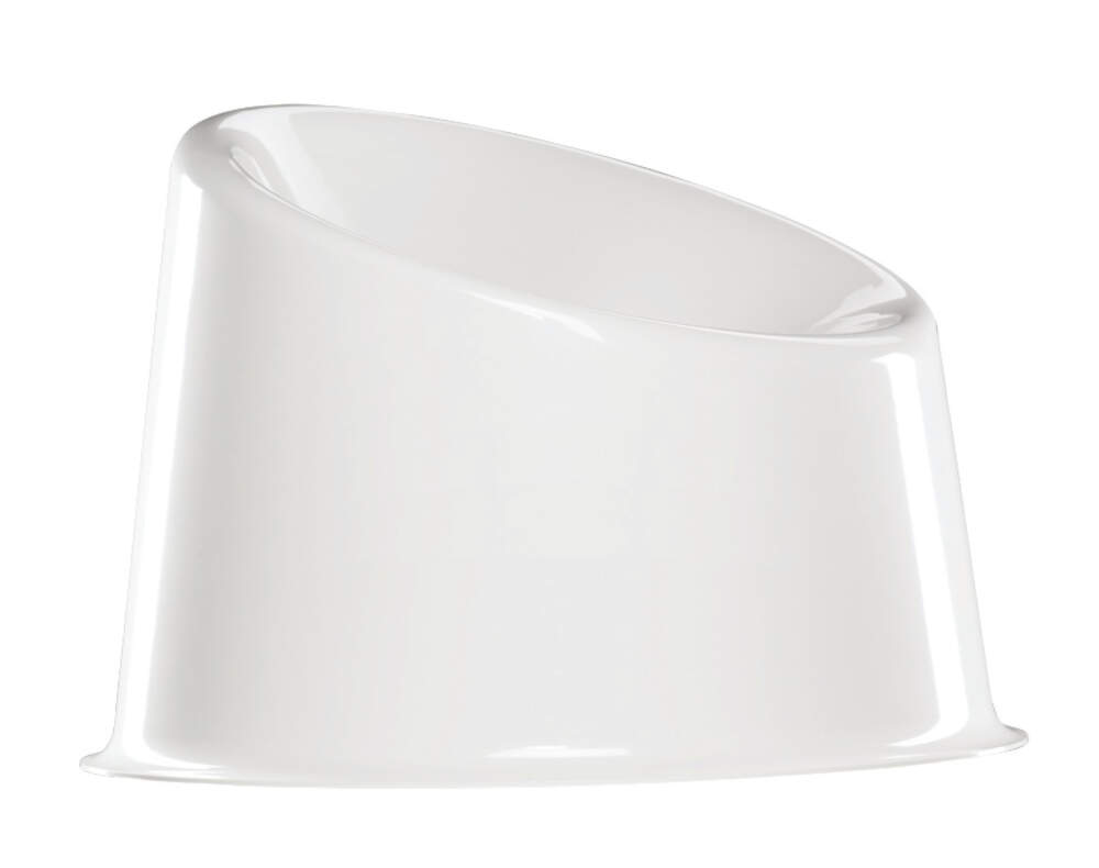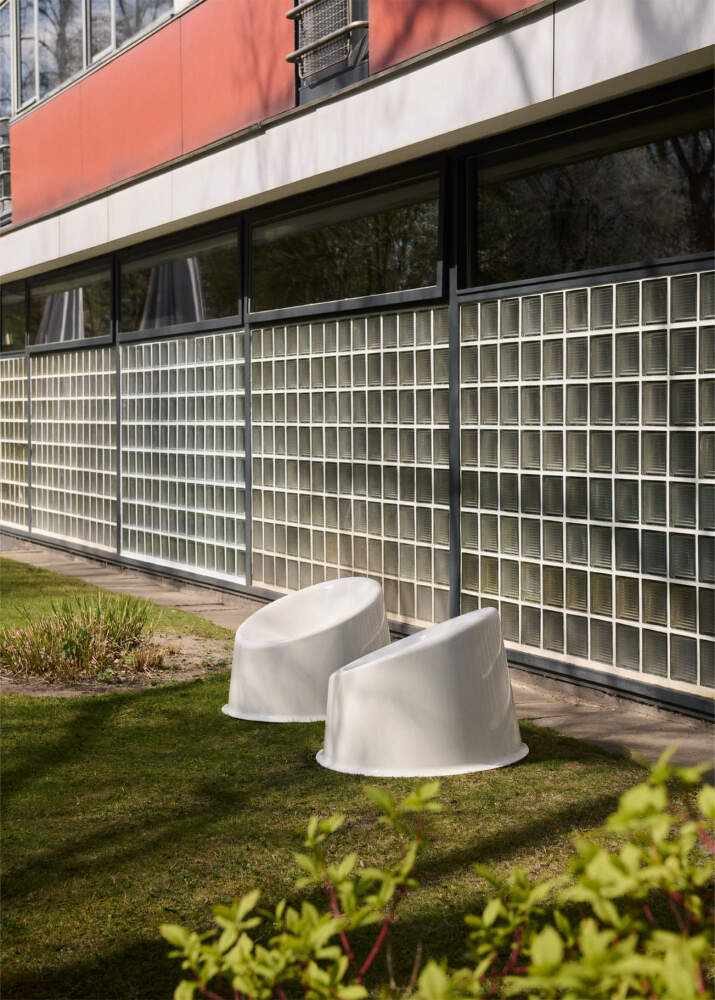 Odolné plastové kreslo Panto Pop od dánskej značky Verpan, ktoré navrhol dizajnér Verner Panton. Farba: biela.