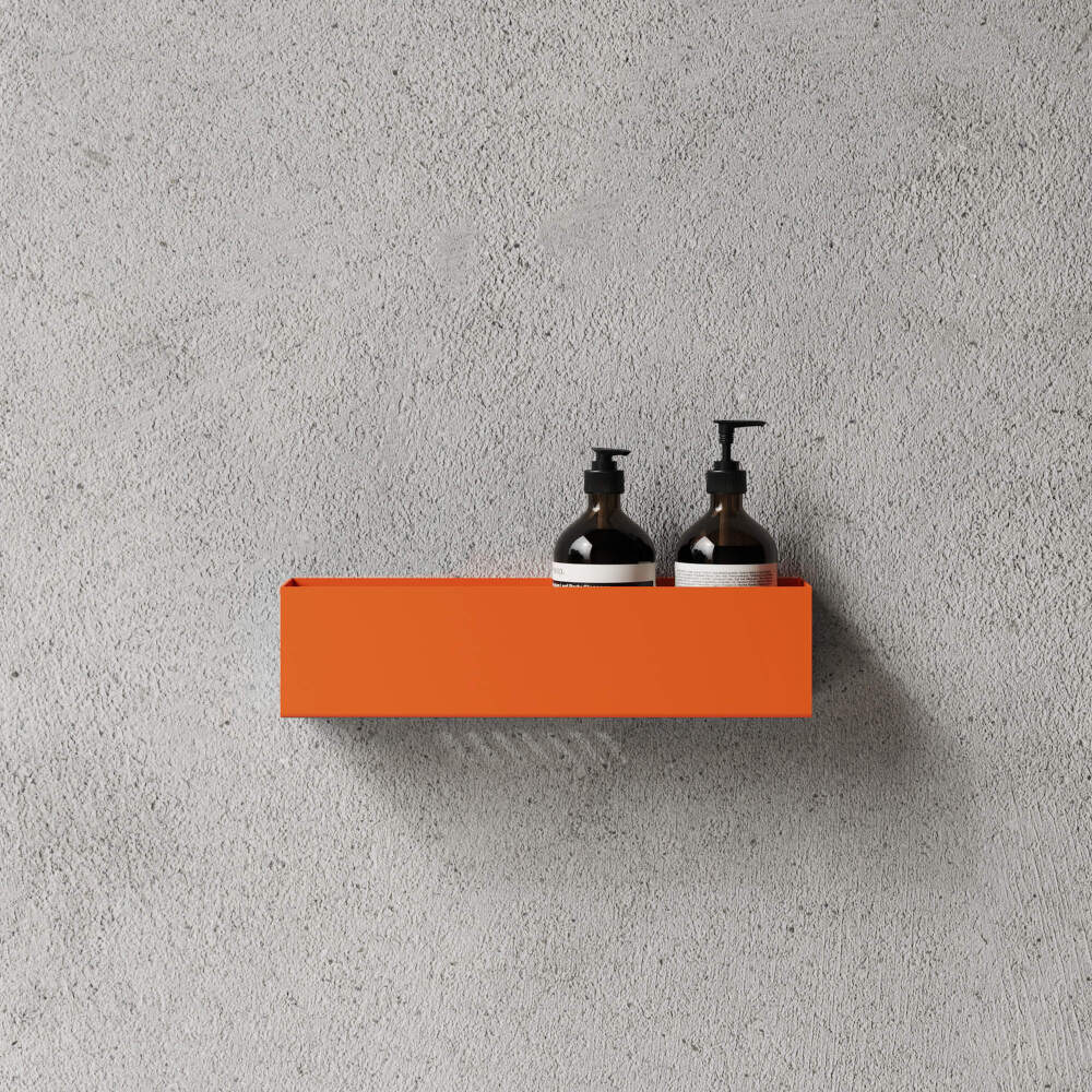 Minimalistická odkladacia polica Bath Shelf od značky Nichba v oranžovom prevedení.