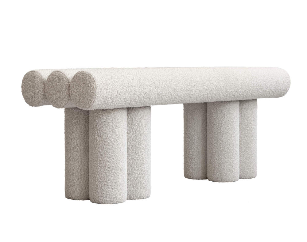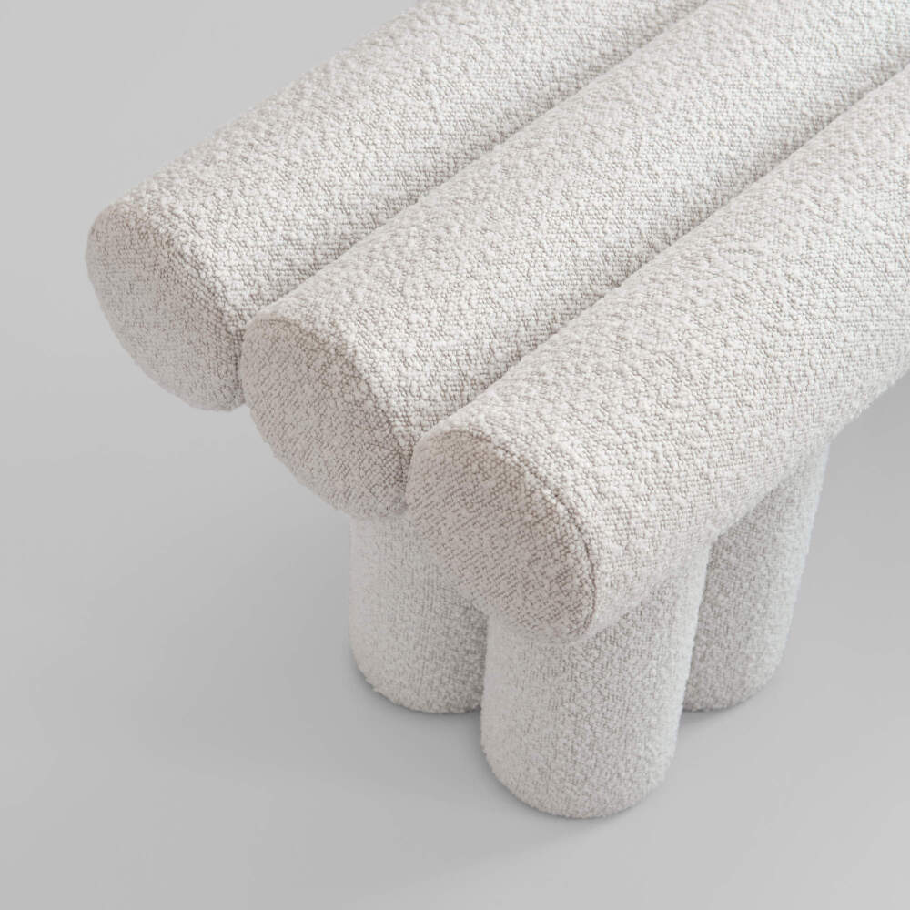 Konštrukciu tvoria čalúnené valce, ktoré zabezpečujú pohodlné sedenie a stabilitu. Použitá látka Bouclé dodáva povrchu príjemnú štruktúru a zároveň podporuje odolnosť pri každodennom používaní.