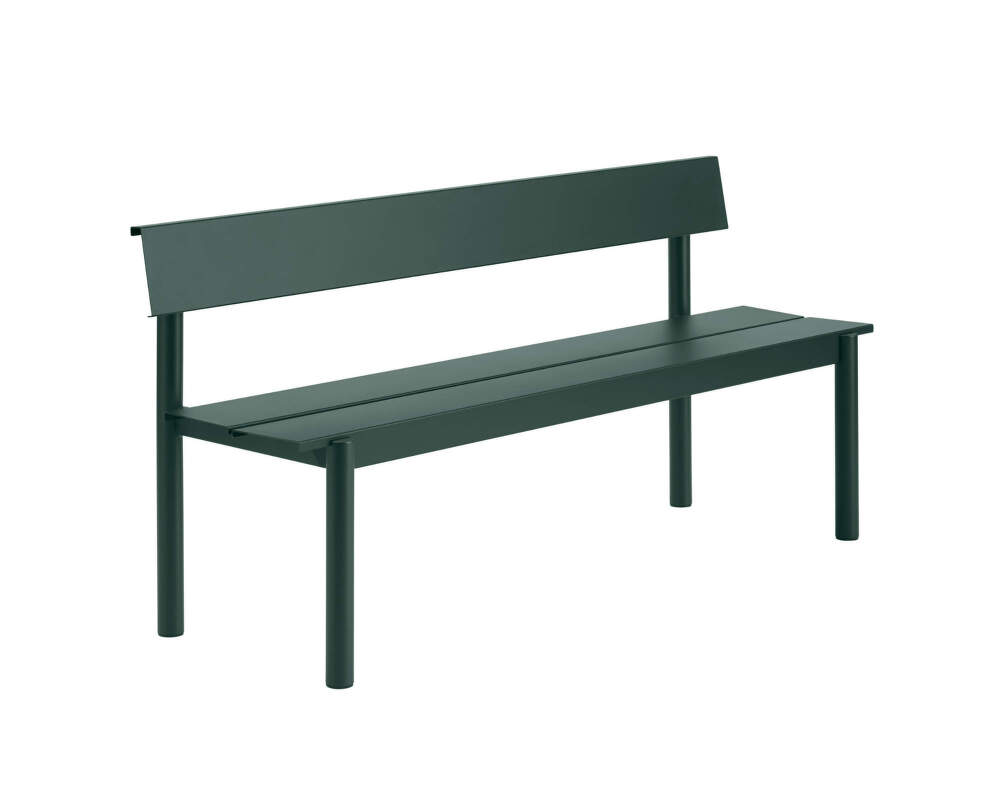 Väčšia oceľová lavica Linear Steel Bench s opierkou z kolekcie moderného vonkajšieho nábytku, ktorú pre dánsku značku Muuto navrhol designér Thomas Bentzen. Prevedenie: tmavozelená.