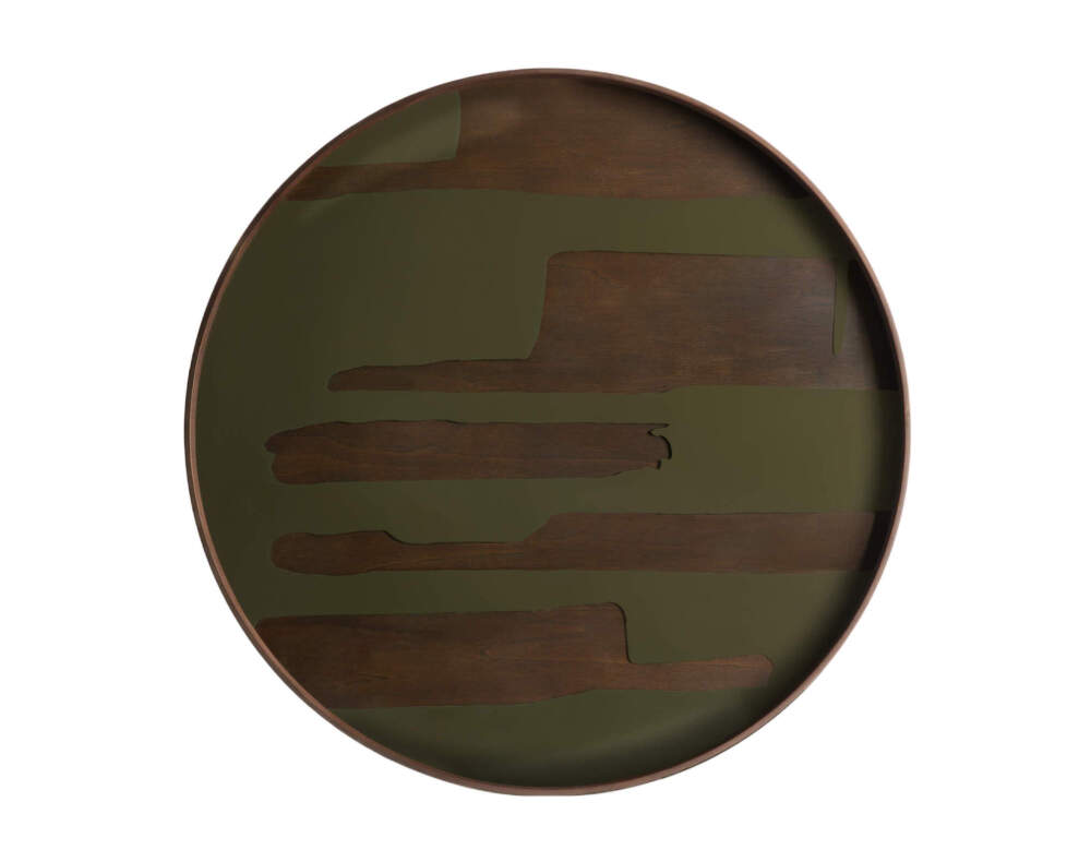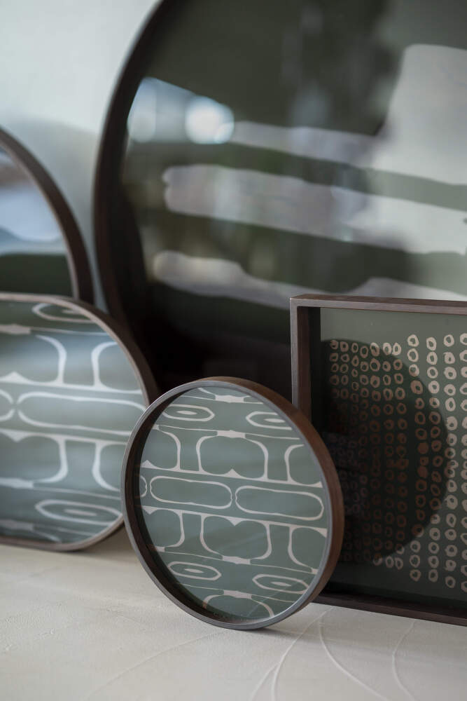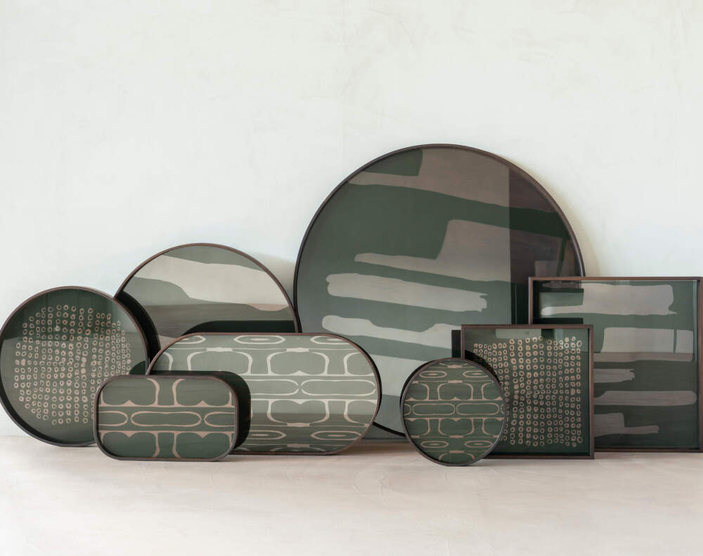Farebná paleta pracuje s machovo zelenými tónmi doplnenými o jemné metalické akcenty, ktoré dodávajú sklenenému povrchu hĺbku a decentnú eleganciu. Podnosy navrhla dizajnérka Dawn Sweitzer tak, aby dokonale ladili so stolíkmi aj ostatnými podnosmi z kolekcie Tray.