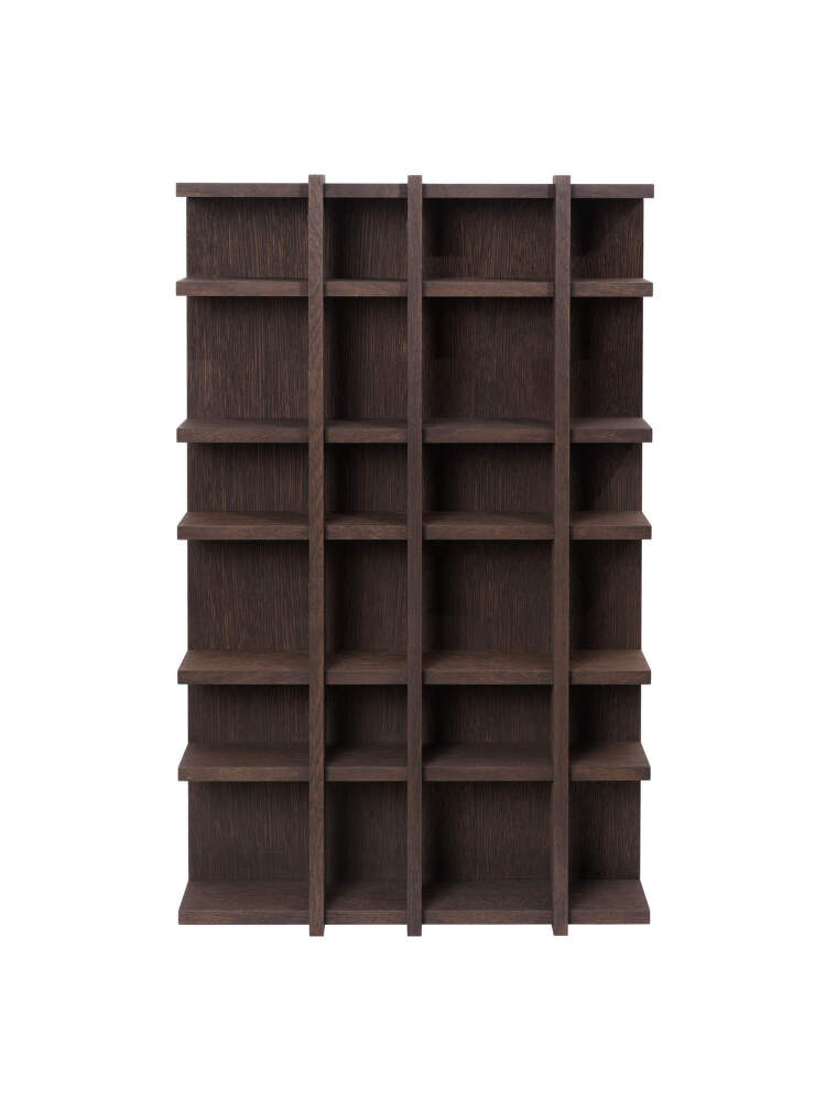Vysoká drevená polica Tilem 4x6 od dánskej značky Ferm Living. Prevedenie: tmavo morený dub.