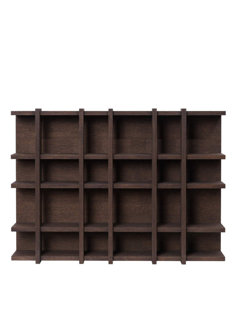 Široká drevená polica Tilem 4x6 od dánskej značky Ferm Living. Prevedenie: tmavo morený dub.