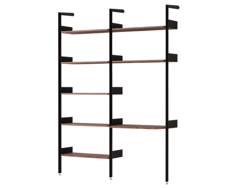Minimalistická policová zostava Rombe v konfigurácii B (IF1+IF5) s pracovnou doskou, ktorú pre dánsku značku &Tradition navrhlo štúdio Industrial Facility. Prevedenie: antracitové konzoly, police a stolová doska z lakovaného orechu.