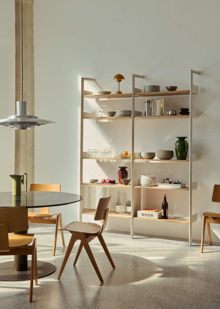 Minimalistická policová zostava Rombe v konfigurácii C (IF1+IF6) ze skrinkou, ktorú pre dánsku značku &Tradition navrhlo štúdio Industrial Facility. Prevedenie: alabastrové konzoly a police.
