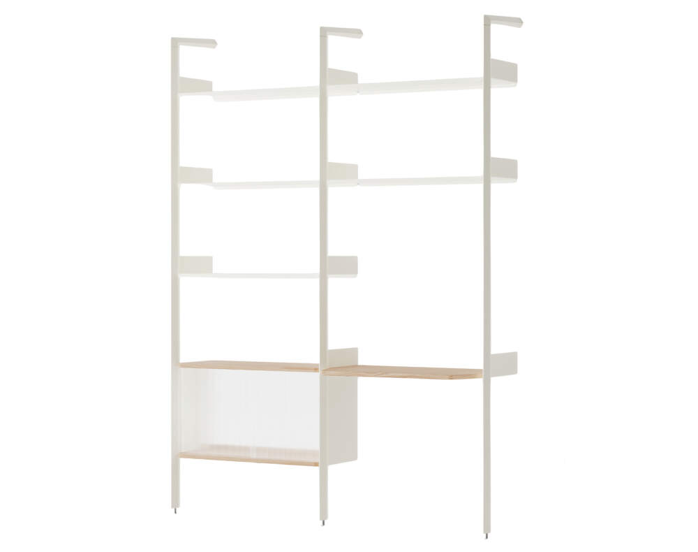 Rombe v konfigurácii D kombinuje klasické policové riešenie s integrovaným stolíkom, čo z neho robí ideálnu voľbu pre domáce kancelárie alebo kreatívne pracovné kútiky. Súčastiou je skrinka vybavená posuvnými dverami z rákosového skla, ktoré prepúšťajú svetlo, ale zároveň zabezpečujú decentné zakrytie uložených predmetov. Táto varianta umožňuje plynulé prepojenie úložného a pracovného priestoru v jednom celku.