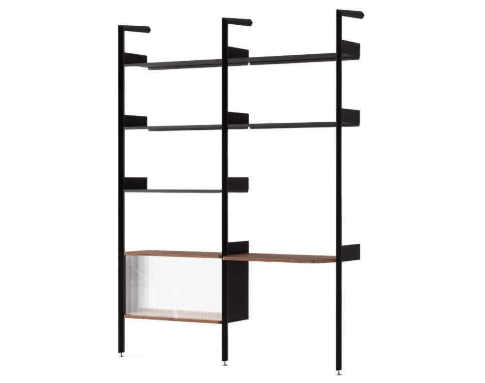 Rombe v konfigurácii D kombinuje klasické policové riešenie s integrovaným stolíkom, čo z neho robí ideálnu voľbu pre domáce kancelárie alebo kreatívne pracovné kútiky. Súčastiou je skrinka vybavená posuvnými dverami z rákosového skla, ktoré prepúšťajú svetlo, ale zároveň zabezpečujú decentné zakrytie uložených predmetov. Táto varianta umožňuje plynulé prepojenie úložného a pracovného priestoru v jednom celku.