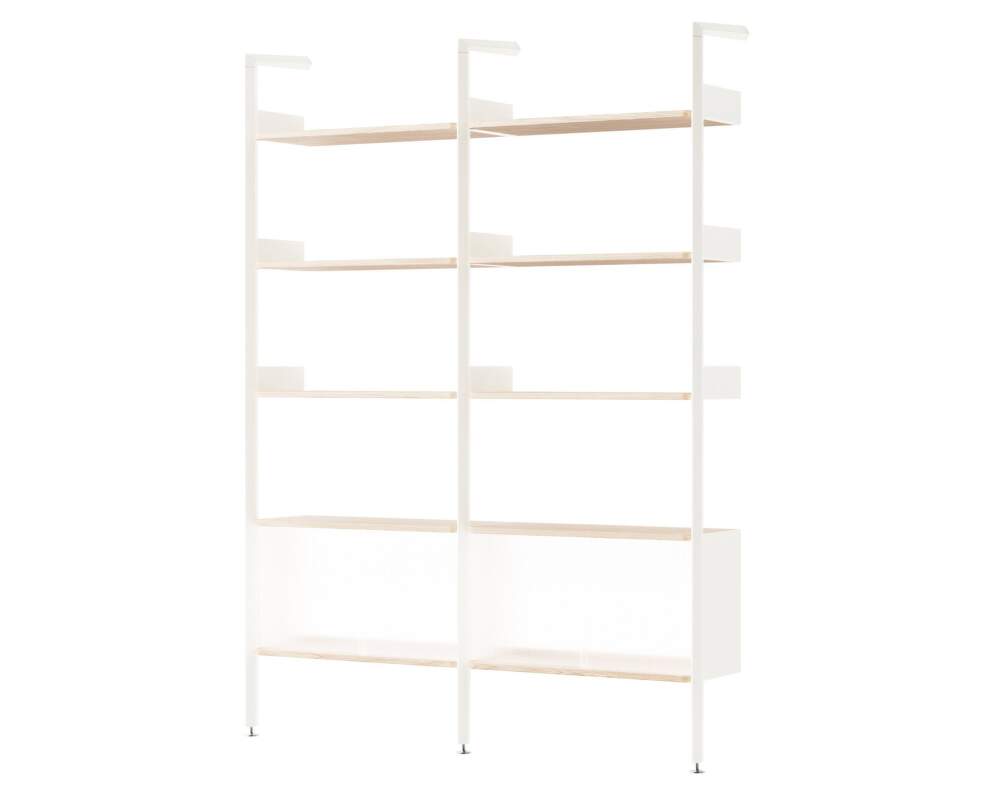 Minimalistická policová zostava Rombe v konfigurácii E (IF3+IF6) s dvoma skriňkami, ktorú pre dánsku značku &Tradition navrhlo štúdio Industrial Facility. Prevedenie: alabastrové konzoly, police z lakovaného dubu.