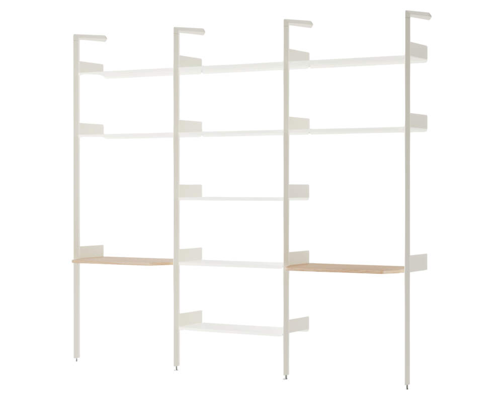 Minimalistická policová zostava Rombe v konfigurácii I (IF2+IF4+IF5) s dvoma pracovnými doskami, ktorú pre dánsku značku &Tradition navrhlo štúdio Industrial Facility. Prevedenie: alabastrové konzoly a police, doska z lakovaného dubu.