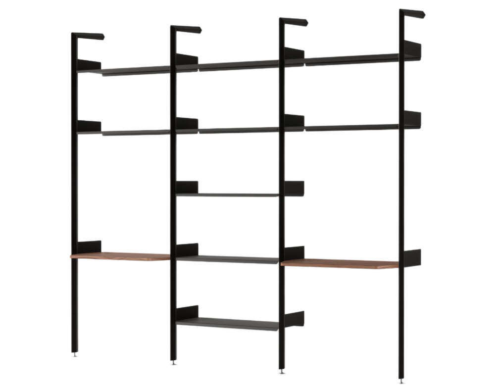 Minimalistická policová zostava Rombe v konfigurácii I (IF2+IF4+IF5) s dvoma pracovnými doskami, ktorú pre dánsku značku &Tradition navrhlo štúdio Industrial Facility. Prevedenie: antracitové konzoly a police, dosky z lakovaného orecha.