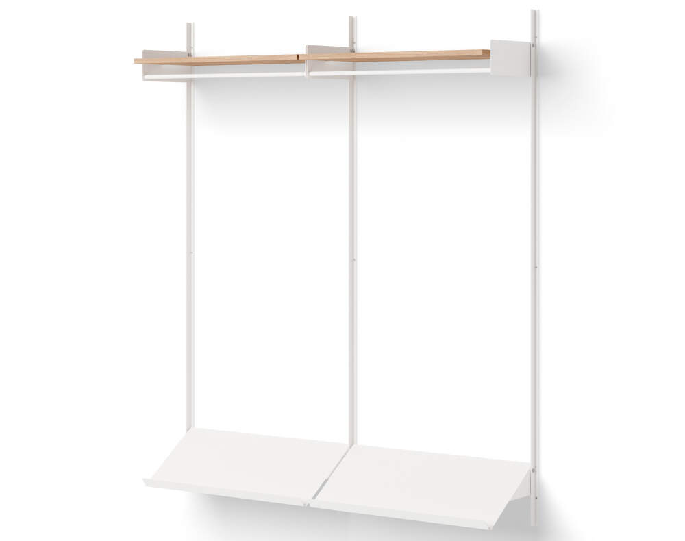 Jednoduchá policová zostava Wardrobe Shelf 2 od značky New Works, ktorú navrhol Knut Bendik Humlevik. Prevedenie: dub a biela.