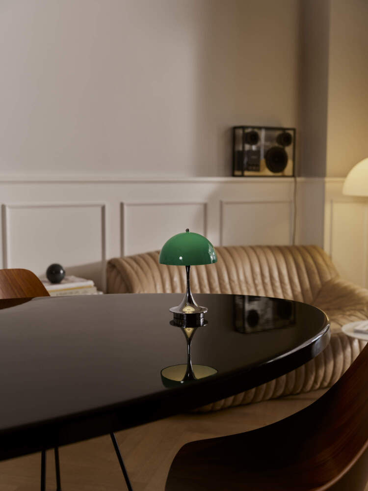 Prenosná dizajnová lampa Panthella 160 V3, ktorú navrhol slávny dizajnér Verner Panton pre dánsku značku Louis Poulsen. Prevedenie: chrómová základňa, opálové tienidlo v zelenej farbe.