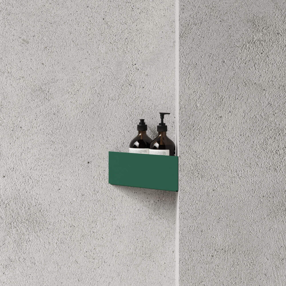 Minimalistická rohová odkladacia polica Bath Shelf Corner od značky Nichba v zelenom prevedení.