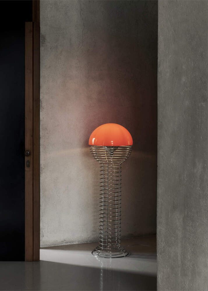 Stojacia lampa Wire patrí k ikonickým návrhom Vernera Pantona z počiatku 70. rokov a predstavuje experiment s oceľovým drôtom v jeho najčistejšej podobe. Otvorená konštrukcia z pochrómovaného drôtu vytvára ľahkú a geometricky presnú siluetu. Svetlo tu nie je iba funkčným prvkom, ale stáva sa hlavným aktérom priestoru.