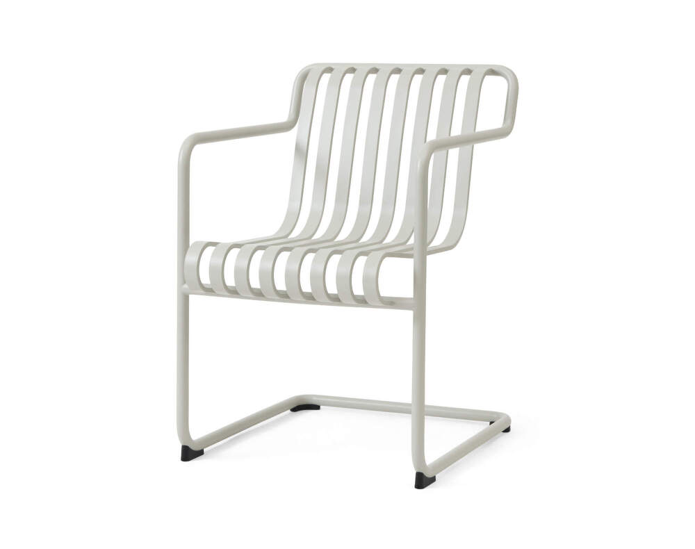 Oceľová stolička Palissade Cantilever Dining Armchair z kolekcie moderného vonkajšieho nábytku, ktorú navrhol Ronan Bouroullec pre dánsku značku HAY. Farba: sivá.