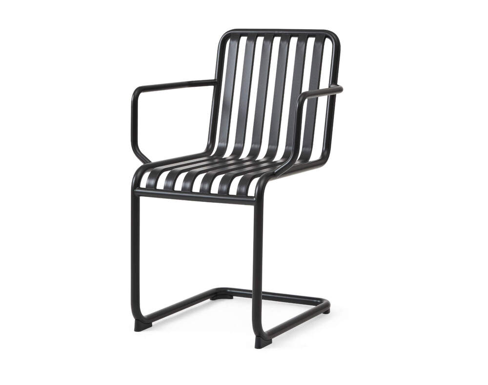 Oceľová stolička Palissade Cantilever s podrúčkami z kolekcie moderného vonkajšieho nábytku, ktorú navrhol Ronan Bouroullec pre dánsku značku HAY. Farba: antracitová.