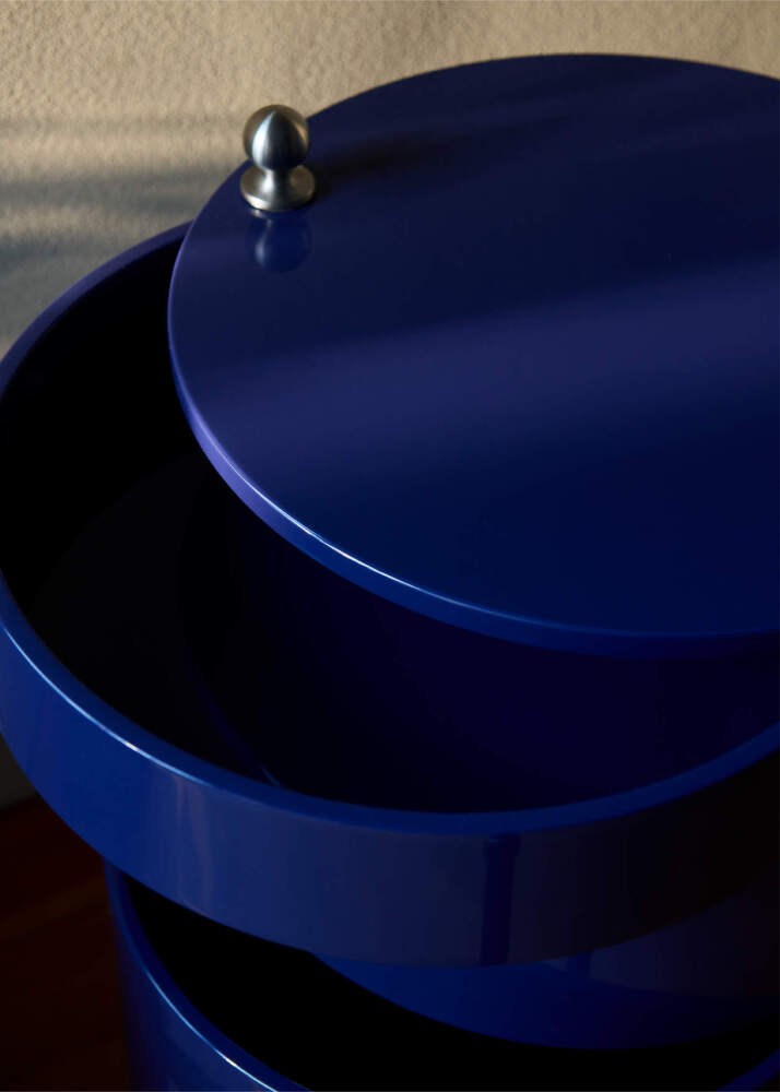 Originálny odkladací stolík Barboy od dánskej značky Verpan, ktorý navrhol Verner Panton. Farba: lesklá tmavomodrá.