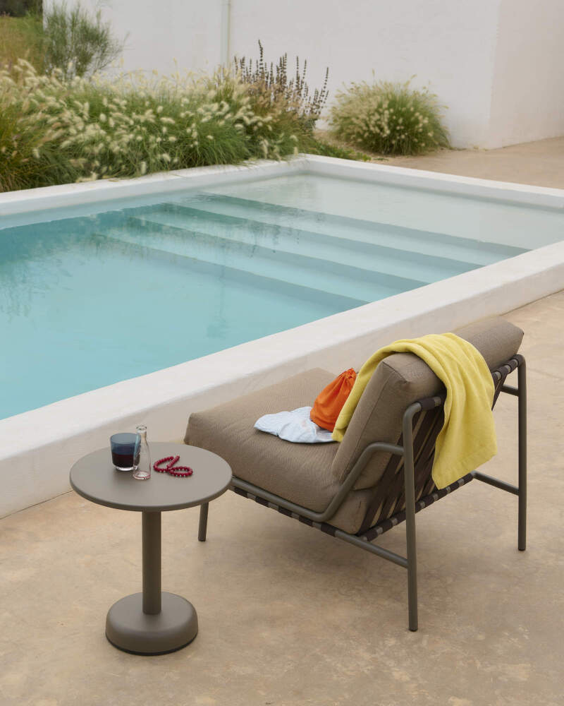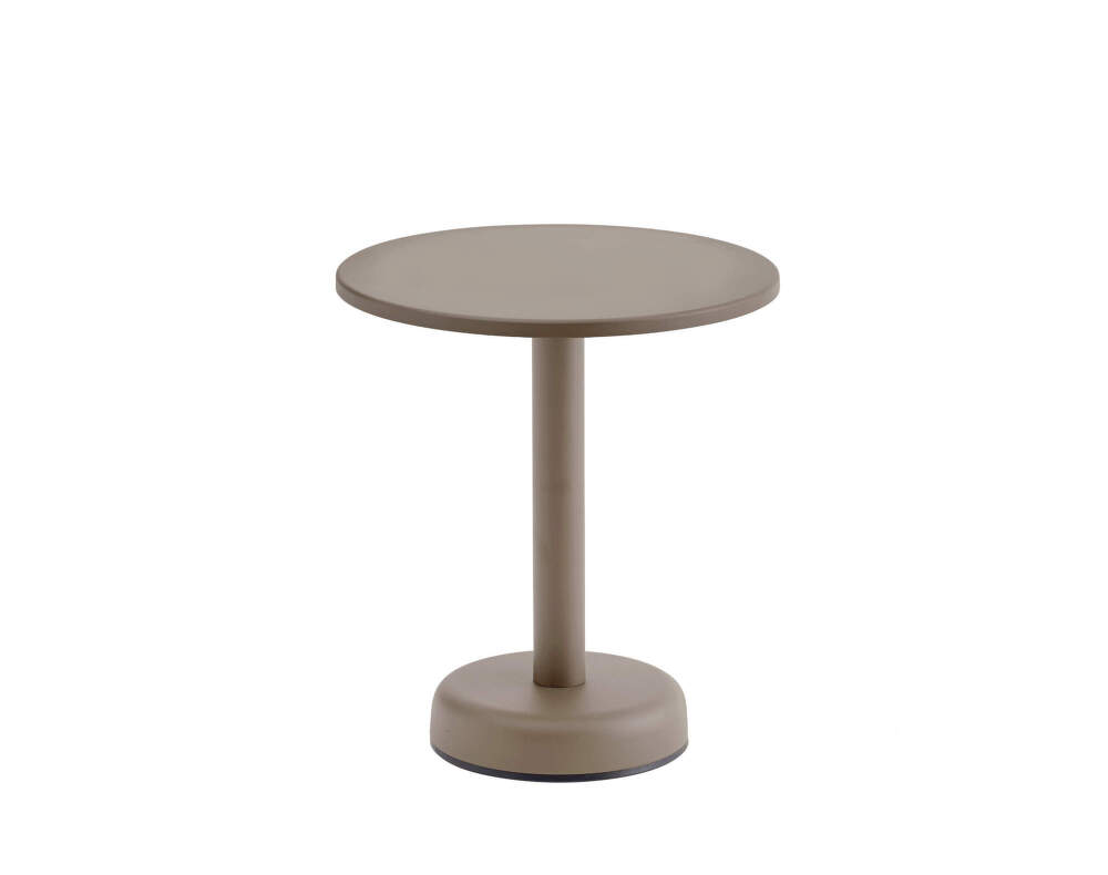 Oceľový stolík Linear Steel Coffee Table o priemere 42 cm, z kolekcie moderného vonkajšieho nábytku, ktorý navrhol pre dánsku značku Muuto dizajnér Thomas Bentzen. Prevedenie: hnedosivá.