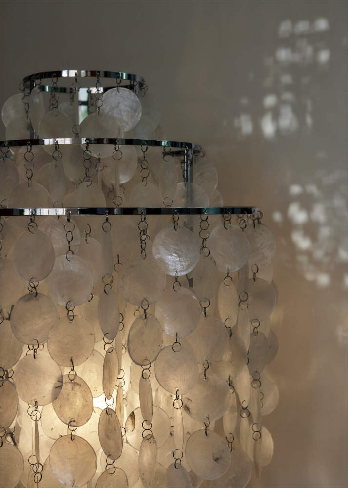 Reťaze z perleťových mušľových diskov zavesených na kovovej konštrukcii filtrujú svetlo do mäkkej, teplej žiary bez oslnenia. Pri jemnom pohybe vytvárajú subtílny zvukový efekt, ktorý dodáva lampe živý a zmyslový rozmer. Chrómovaný rám zvýrazňuje kontrast medzi technickou precíznosťou konštrukcie a organickou textúrou mušlí.