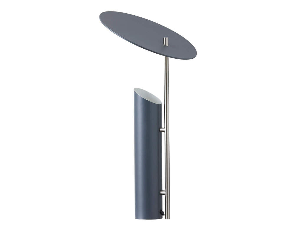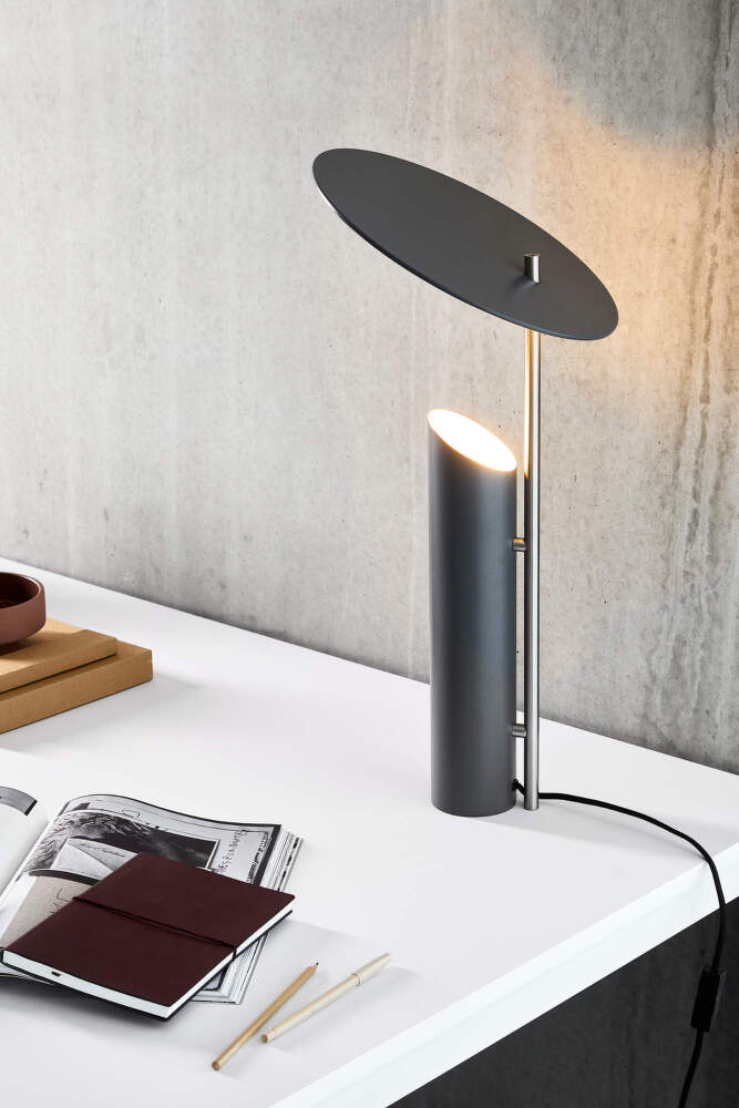 Svetlo vychádza z trubicovej základne smerom nahor a dopadá na biely povrch tienidla, odkiaľ sa mäkko rozptyľuje do okolia. Všetky časti lampy sú vyrobené z ocele s práškovo lakovanou povrchovou úpravou, zvislá tyč má saténový finiš. Materiálová jednoduchosť podčiarkuje grafickú čistotu návrhu a jeho precíznu siluetu.
