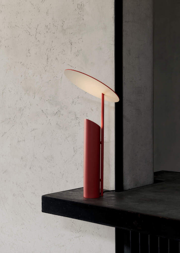Svetlo vychádza z trubicovej základne smerom nahor a dopadá na biely povrch tienidla, odkiaľ sa mäkko rozptyľuje do okolia. Všetky časti lampy sú vyrobené z ocele s práškovo lakovanou povrchovou úpravou, zvislá tyč má saténový finiš. Materiálová jednoduchosť podčiarkuje grafickú čistotu návrhu a jeho precíznu siluetu.