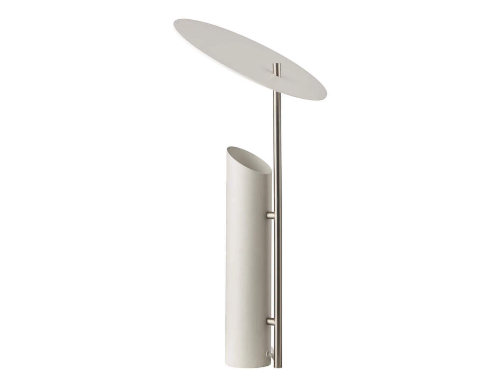 Svetlo vychádza z trubicovej základne smerom nahor a dopadá na biely povrch tienidla, odkiaľ sa mäkko rozptyľuje do okolia. Všetky časti lampy sú vyrobené z ocele s práškovo lakovanou povrchovou úpravou, zvislá tyč má saténový finiš.