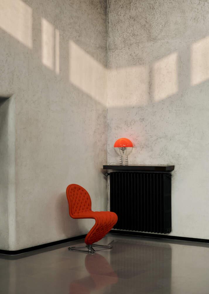 Stolná lampa Wire patrí k ikonickým návrhom Vernera Pantona z počiatku 70. rokov a predstavuje experiment s oceľovým drôtom v jeho najčistejšej podobe. Otvorená konštrukcia z pochrómovaného drôtu vytvára ľahkú a geometricky presnú siluetu. Svetlo tu nie je iba funkčným prvkom, ale stáva sa hlavným aktérom priestoru.