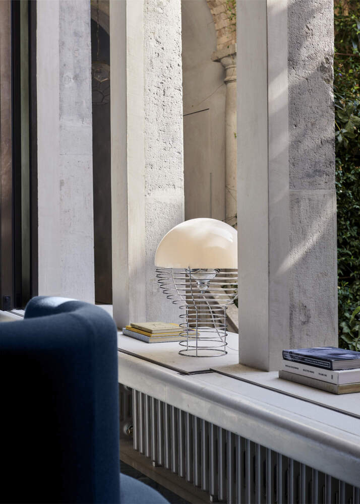 Stolná lampa Wire patrí k ikonickým návrhom Vernera Pantona z počiatku 70. rokov a predstavuje experiment s oceľovým drôtom v jeho najčistejšej podobe. Otvorená konštrukcia z pochrómovaného drôtu vytvára ľahkú a geometricky presnú siluetu. Svetlo tu nie je iba funkčným prvkom, ale stáva sa hlavným aktérom priestoru.