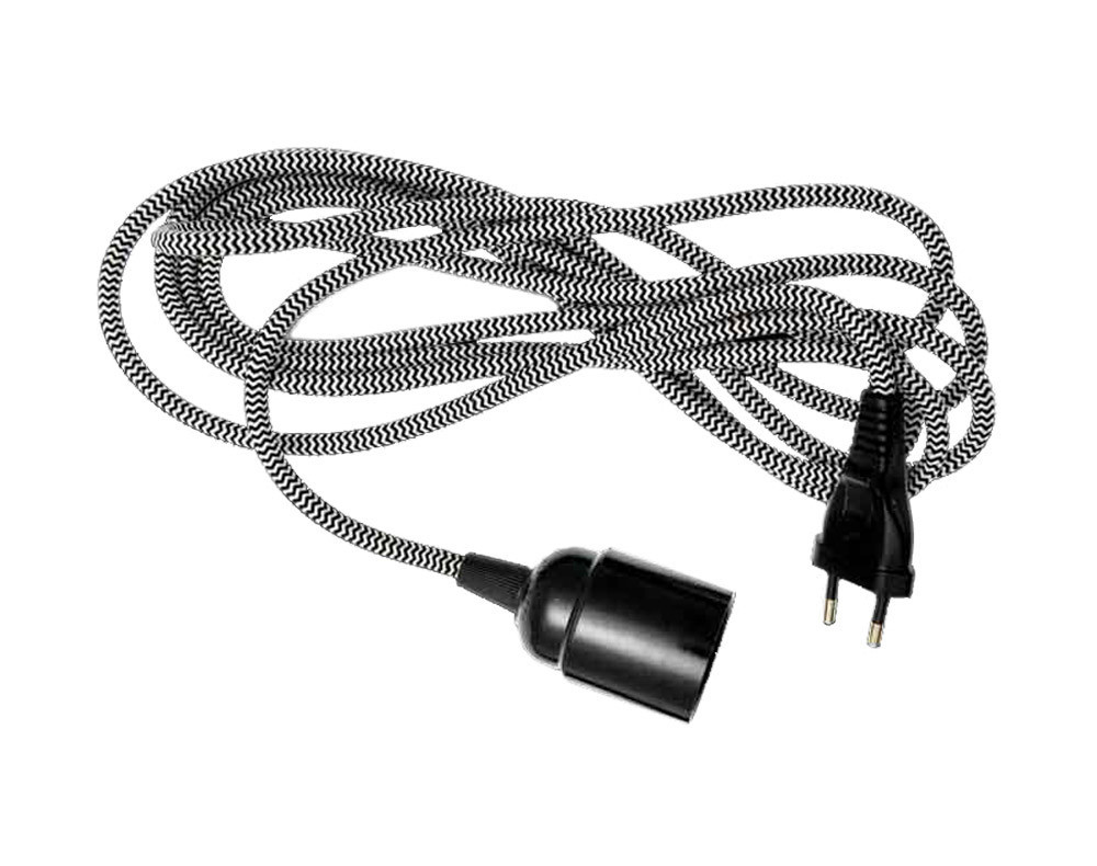 Čierno-biely textilný elektrický kábel s objímkou a zástrčkou. Vhodný tiež pre inštaláciu dekoratívnych žiaroviek bez tienidla, napríklad pre retro žiarovky Danlamp so závitom E27.
