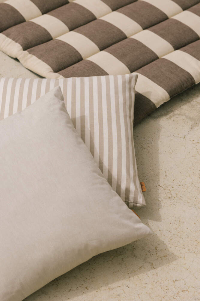 Odolný vonkajší vankúš Strand od dánskej značky Ferm Living. Farba: béžová/hnedá/modrá.