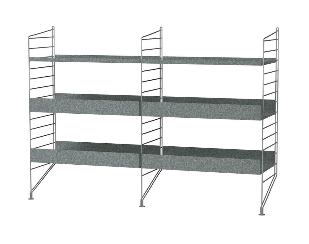 Konštrukcia z pozinkovanej ocele je navrhnutá pre vonkajšie použitie a vyniká svojou odolnosťou aj prirodzenou schopnosťou starnúť do charakteristickej patiny. Kombinácia políc s rôznou výškou okrajov dodáva zostave funkčnosť aj vizuálnu dynamiku a umožňuje flexibilné využitie podľa aktuálnych potrieb.