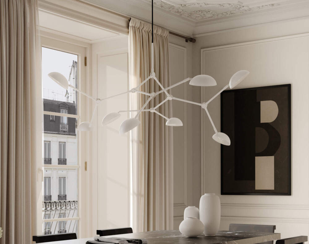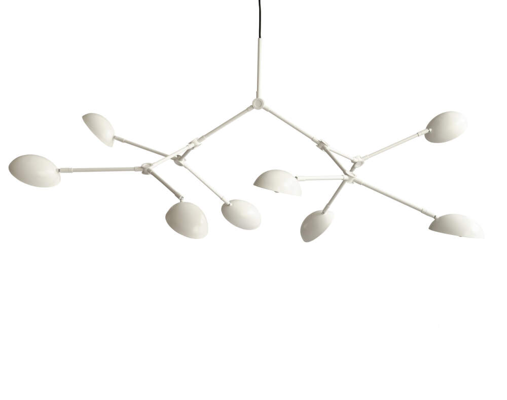 Závesné svietidlo Drop Big v bielej farbe prináša do interiéru jemnú nenápadnú svetelnú kompozíciu, ktorá spája modernistickú estetiku s hravou variáciou. Organicky tvarované tienidlá inšpirované dizajnom 50. rokov pôsobia ľahko a vzdušne, zatiaľ čo 14 nastaviteľných ramien umožňuje upraviť smer svetla a celkový výraz svietidla. Možno vytvárať variácie tvarov, od symetrických kompozícií až po hravo asymetrické usporiadania.