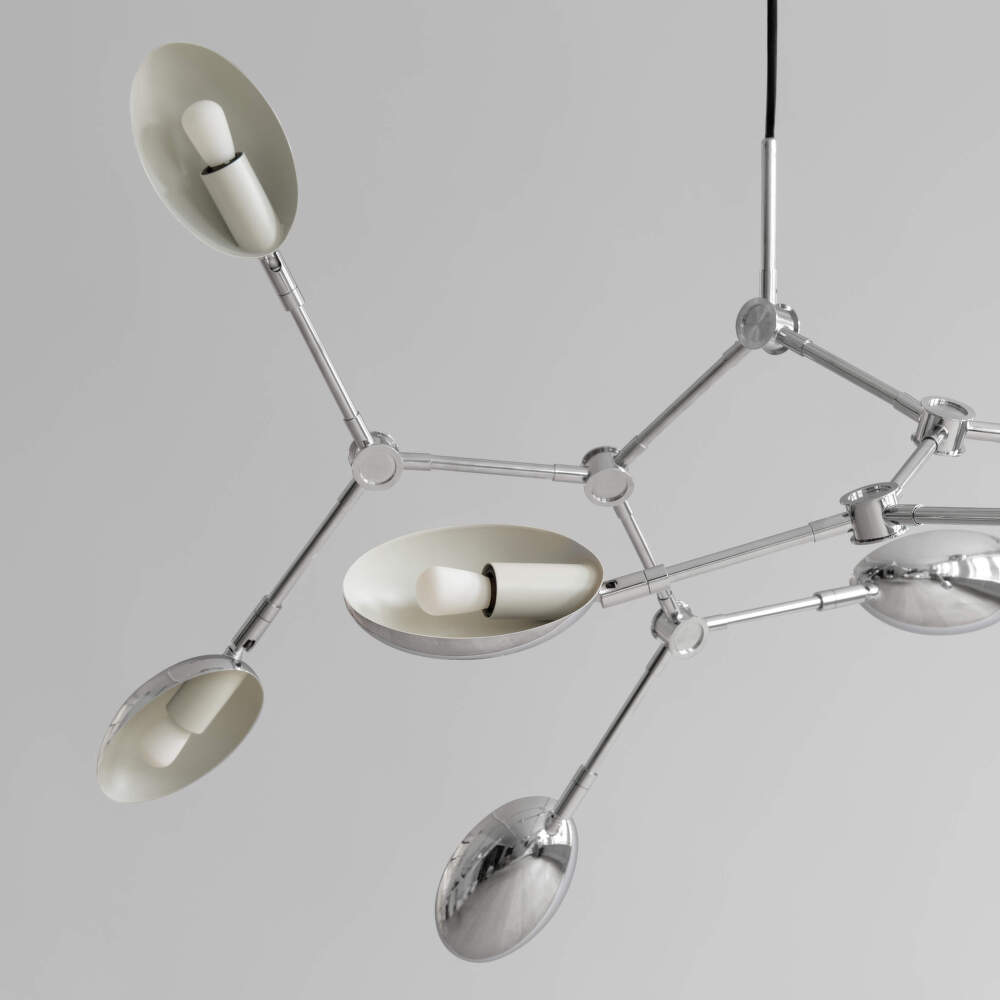 Závesné svietidlo Drop Mini v chrómovom prevedení prináša do interiéru jemnú, ale výraznú svetelnú kompozíciu, ktorá spája modernistickú estetiku s hravou variáciou. Organicky tvarované tienidlá inšpirované dizajnom 50. rokov pôsobia ľahko a vzdušne, zatiaľ čo 14 nastaviteľných ramien umožňuje upraviť smer svetla a celkový výraz svietidla. Možno vytvárať variácie tvarov, od symetrických kompozícií až po hravo asymetrické usporiadania.