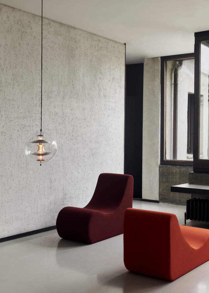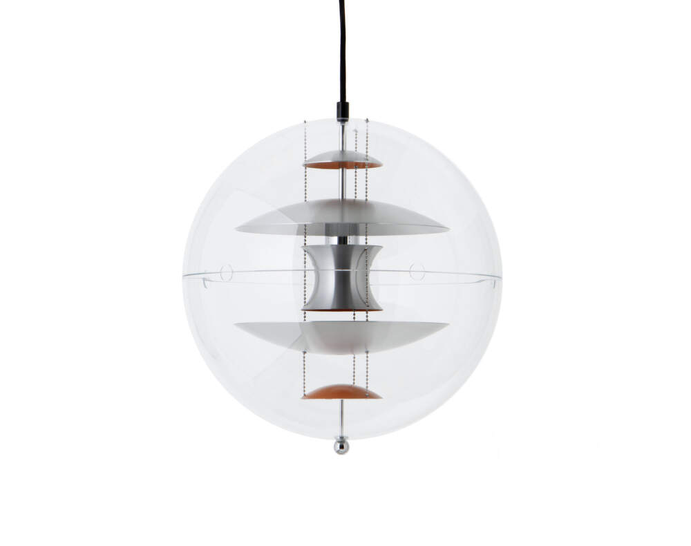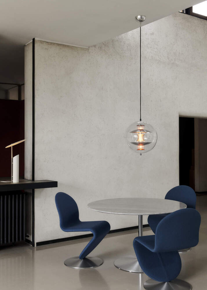 Závesné svietidlo VP Globe patrí k najikonickejším návrhom Vernera Pantona z rokov 1969–1970. Transparentná guľová forma odráža jeho fascináciu novými materiálmi aj presvedčenie, že svetelný zdroj nemá byť priamo viditeľný. Výsledkom je svietidlo, ktoré pôsobí futuristicky a zároveň vytvára mimoriadne príjemné ambientné svetlo.